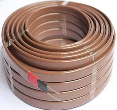 恒功率電伴熱帶RDP2-J3-220V/380V電源母線為二根平行絕緣銅線,在內(nèi)絕緣層上纏繞電熱絲,并將電熱絲每隔一定距離(即“發(fā)熱節(jié)長”)與母線連接,形成連續(xù)并聯(lián)電阻。母線通電后,各并聯(lián)電阻發(fā)熱,因而形成一條連續(xù)的伴熱帶。
