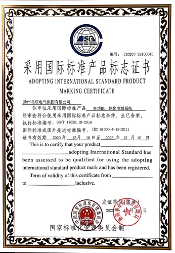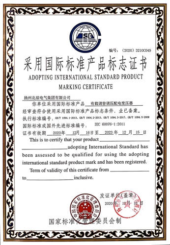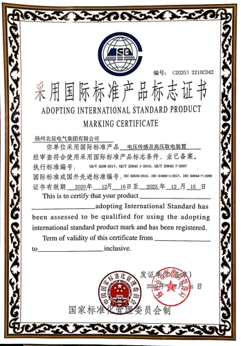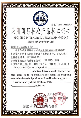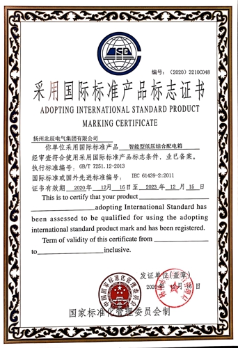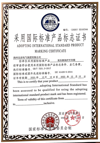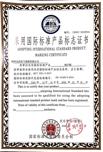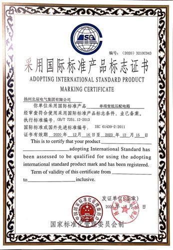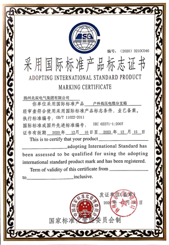 近日,經(jīng)過專業(yè)機構(gòu)審核檢測,揚州北辰電氣集團有限公司自主生產(chǎn)的“端子箱”、“變壓器保護開關(guān)箱”、“戶外高壓電纜分支箱”等九種產(chǎn)品,榮獲國家標準化管理委員會頒發(fā)的“采用國際標準產(chǎn)品標志證書”。現(xiàn)公司已累計有29種產(chǎn)品獲得了采標證書,標準化建設(shè)已處于行業(yè)前列。