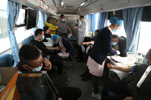 上午八點半,臨時體檢臺前等待獻血的員工們早已自覺排起隊,填表、體檢、上車獻血,一切正有條不紊地進行,愛心獻血車內座無虛席。