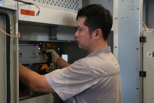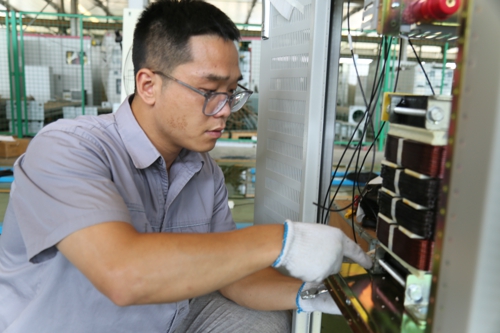 圖為自動化部員工在車間蒸騰的氣息里,完成無錫游圣變一體化電源裝配工作,這是他們的一份責任、一份堅守、一份擔當。