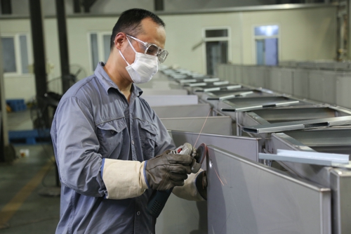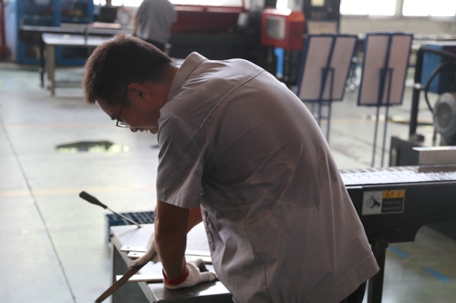 圖為高溫下的堅守者,裝配車間金工班組的員工全副武裝頂酷暑戰高溫,完成常州供電公司低壓電纜分支箱殼體制作工作;