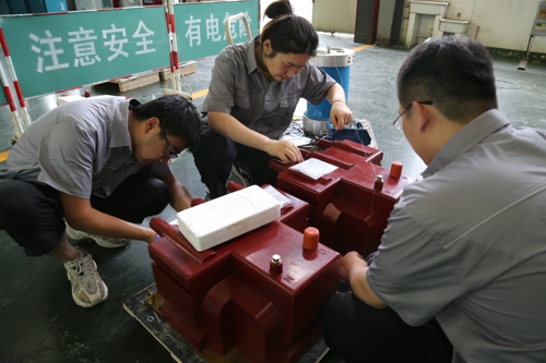 圖為卓能質量事業部質檢人員為每一件來料進行來料檢驗,對無錫本部華盛苑20kV戶內環網柜等工程共15個電壓互感器進行工頻耐壓試驗,為后續的產品質量作出保障。