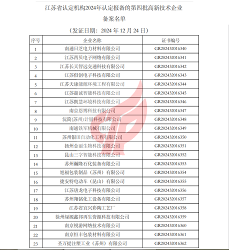 2025年1月14日,高新技術企業認定管理工作網發布了《江蘇省認定機構2024年認定報備的第四批高新技術企業進行備案的公告》,集團公司2024年高新技術企業認定順利通過備案。