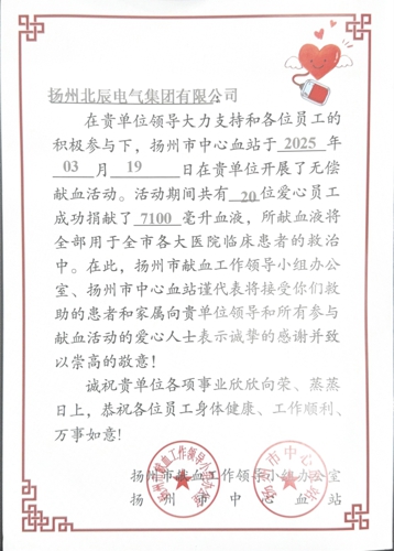 多年來,北辰電氣堅持將公益基因融入企業文化,先后獲評“江蘇省文明單位”、“揚州市文明單位”等稱號。此次獻血活動再次印證了企業“以責任鑄品牌,以熱血暖人心”的初心,積極探索更多服務社會的路徑,為構建和諧社會貢獻更多北辰力量。