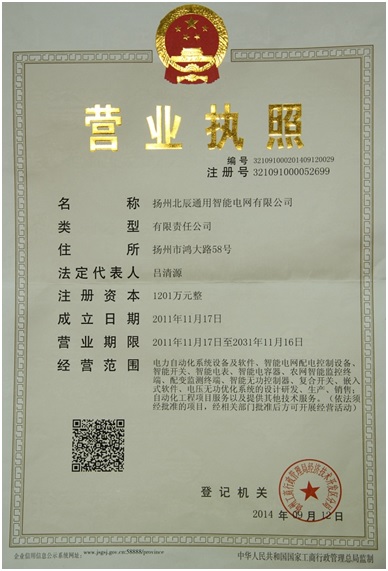 北辰集團子公司揚州通用北辰智能電網工程應用中心有限公司于2014年9月12日將公司名稱變更為揚州北辰通用智能電網有限公司,并已獲得工商行政部門審批核準,相關執照證書均已辦理完畢。